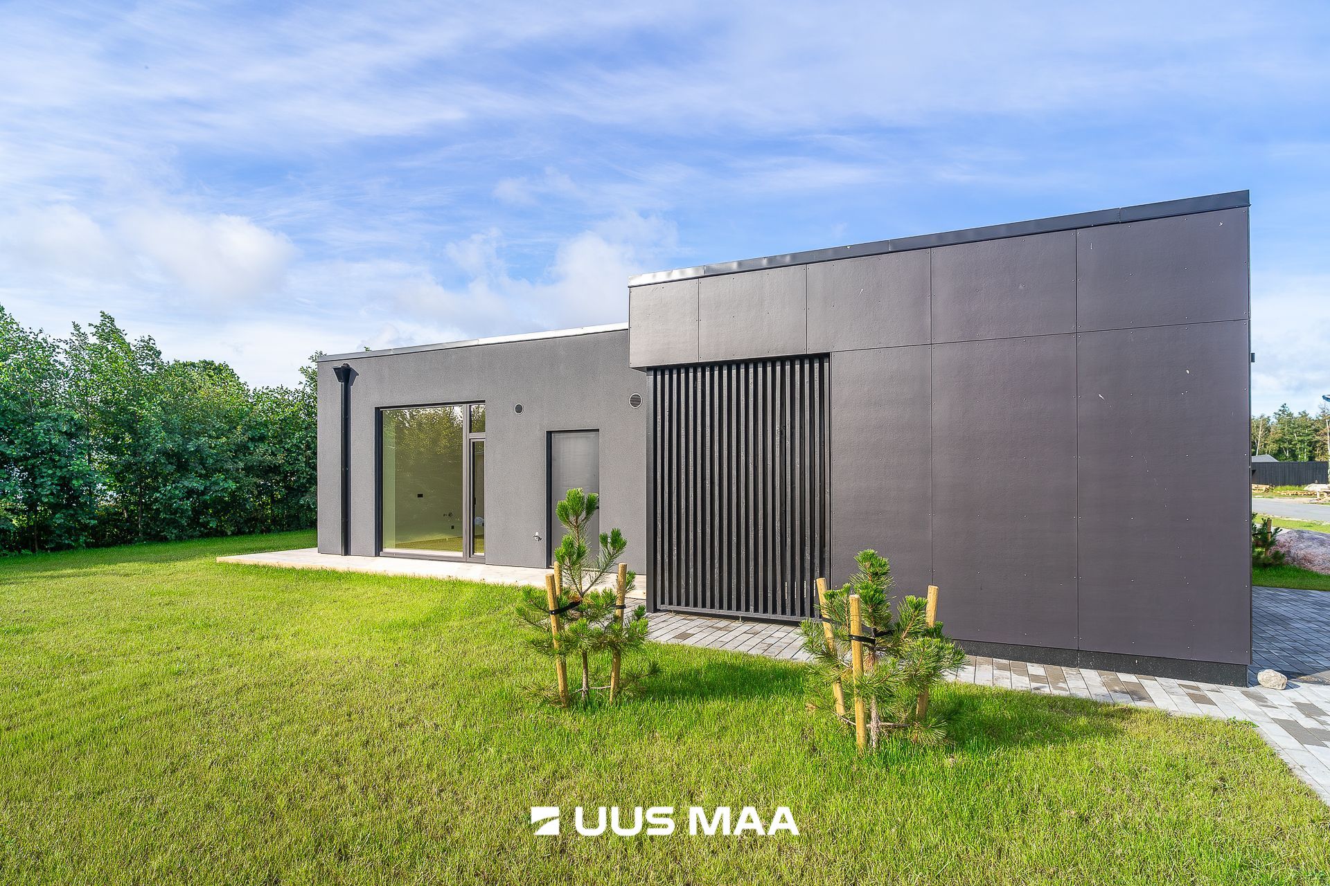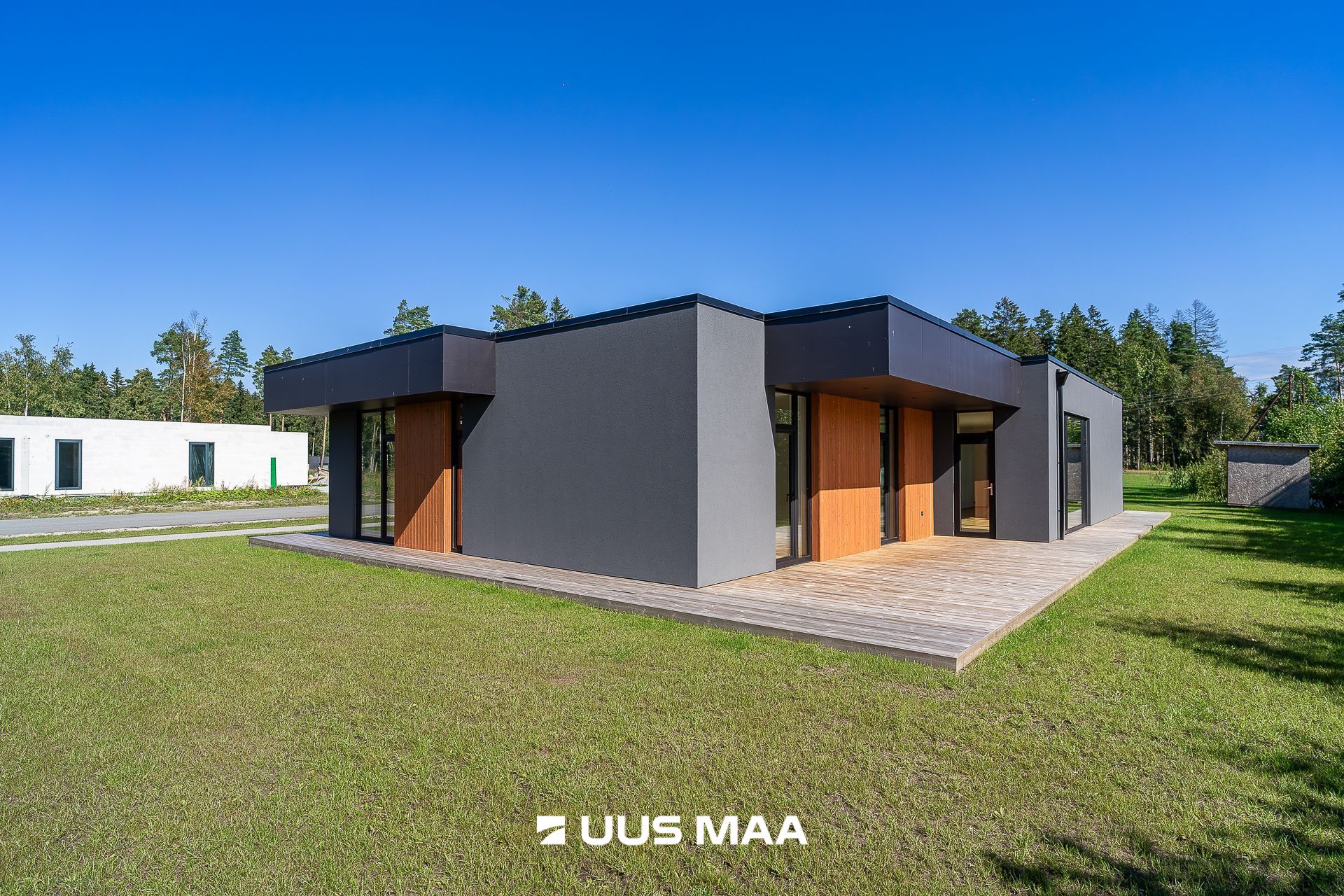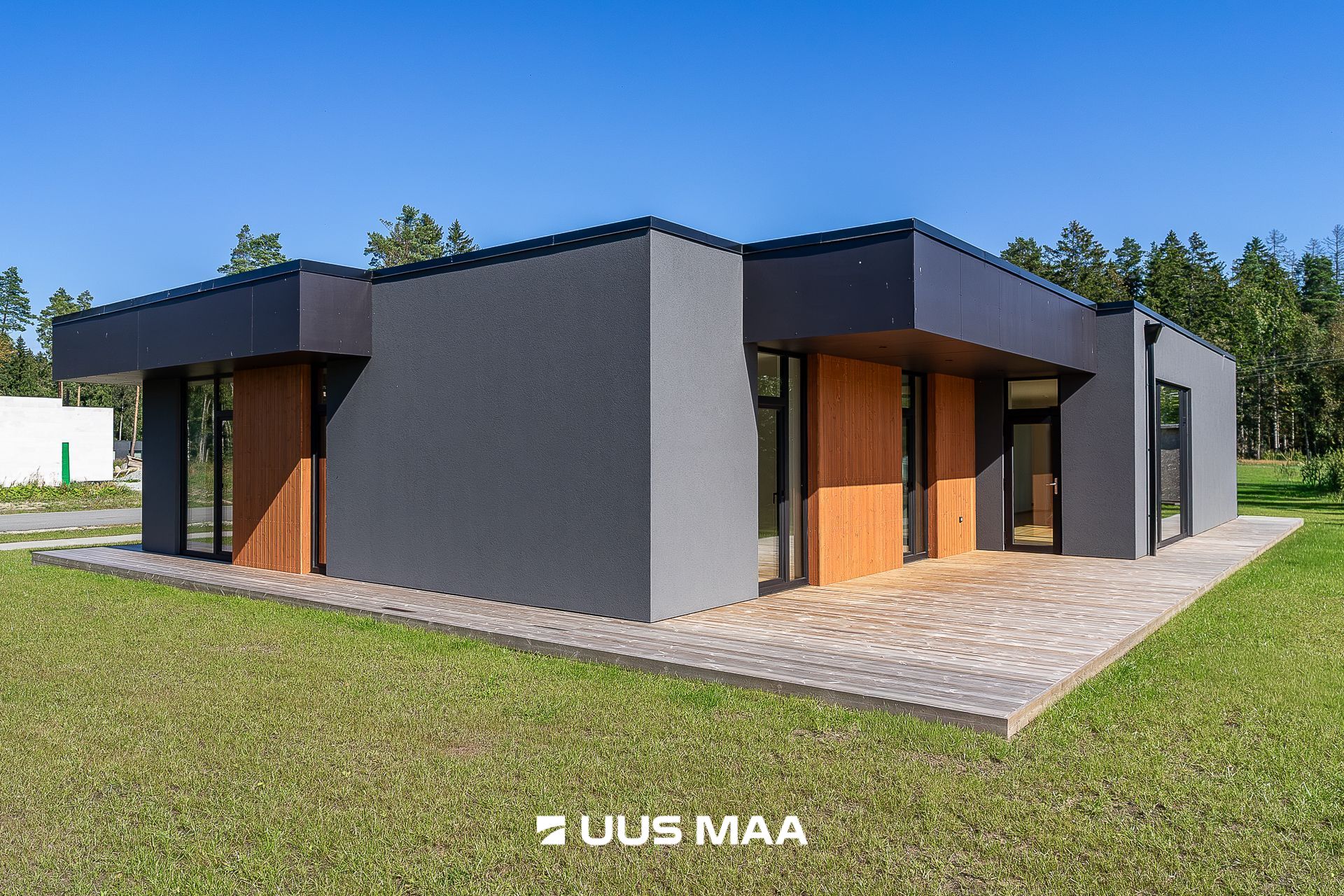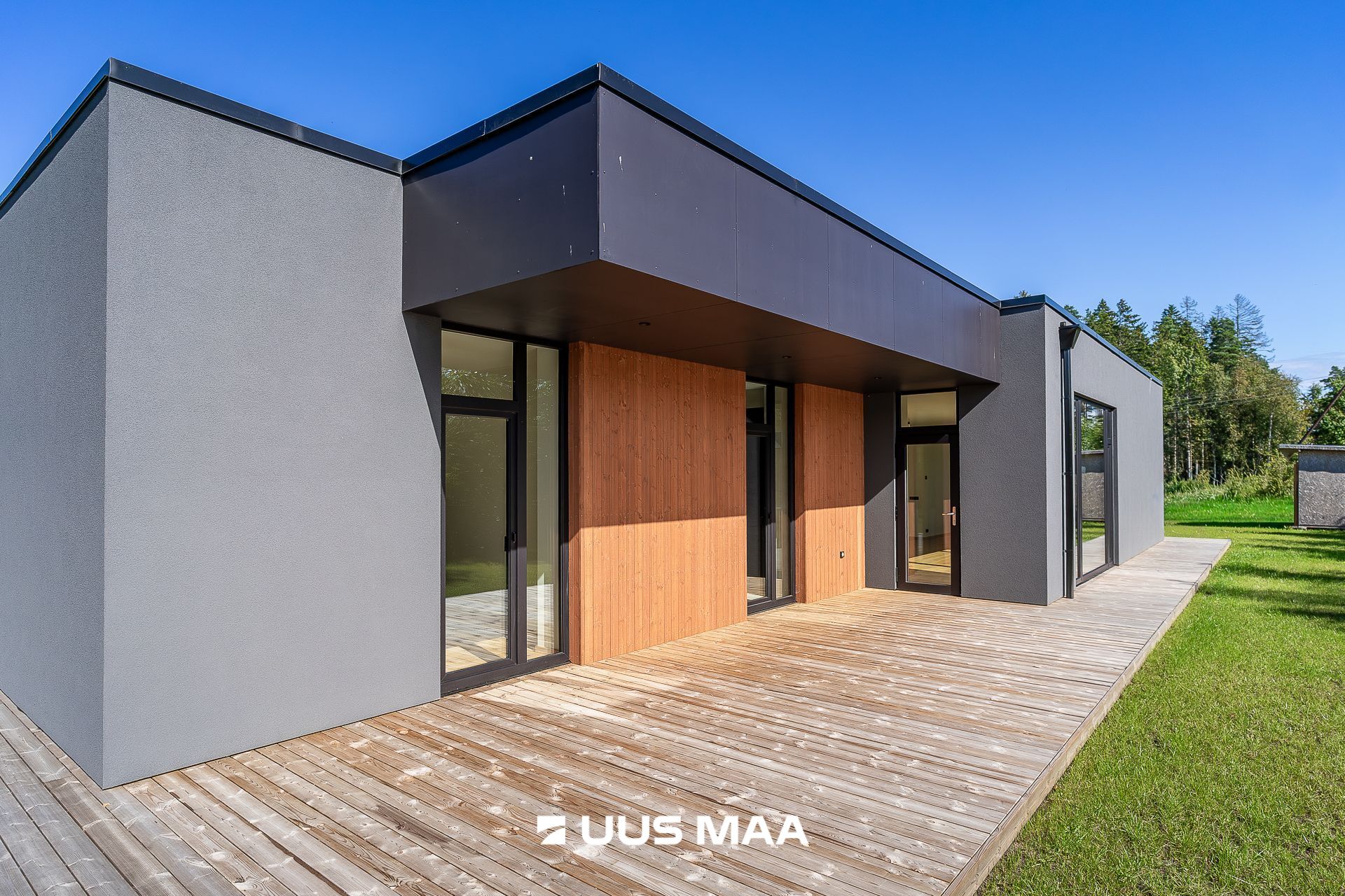 viimistlusmaterjalidena on kasutatud tumedat krohvi, puitu ja katuse parapetil halli viimistlusplaati.