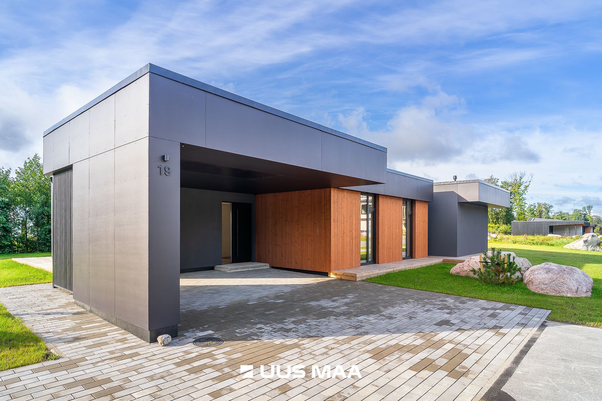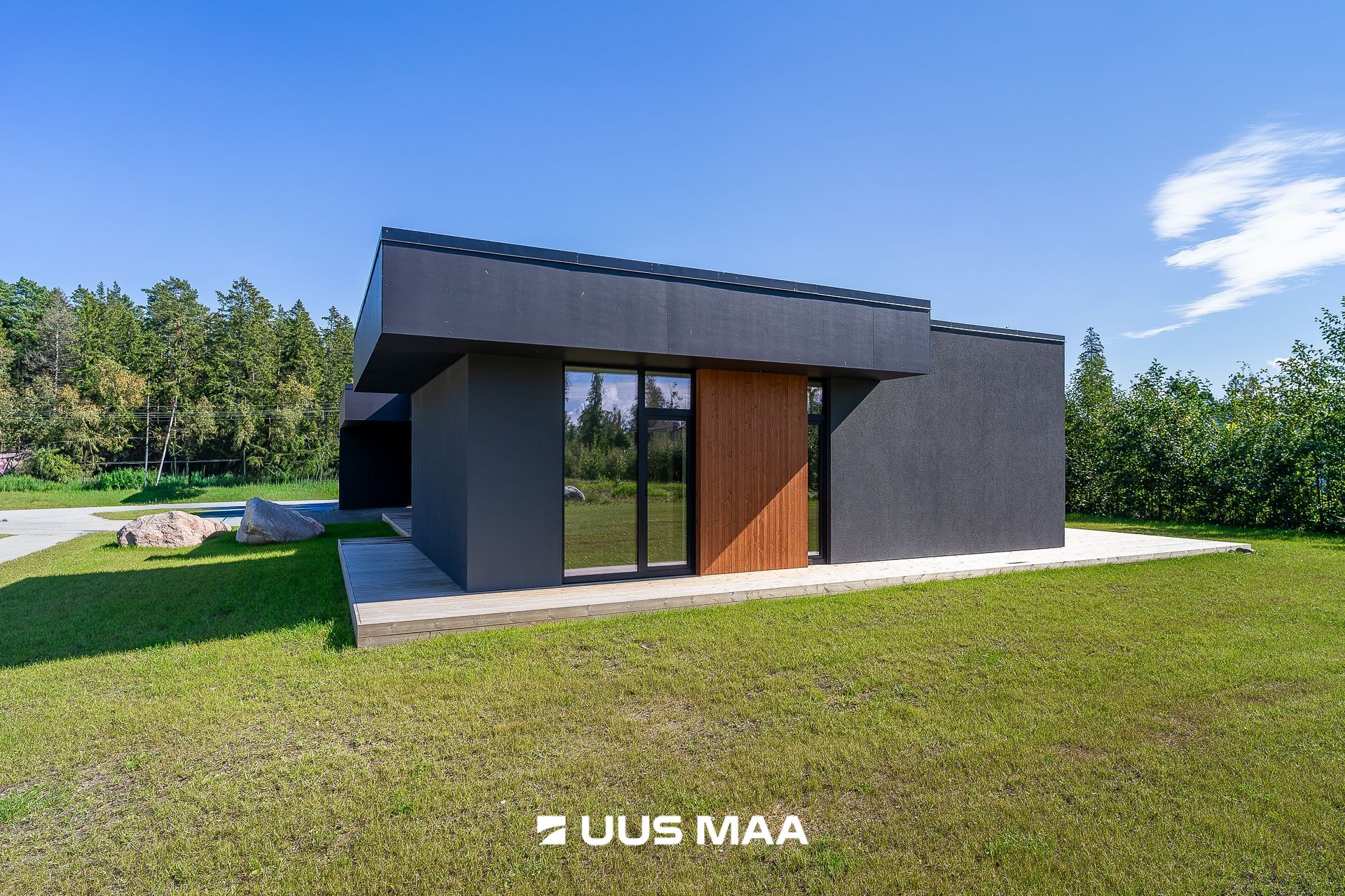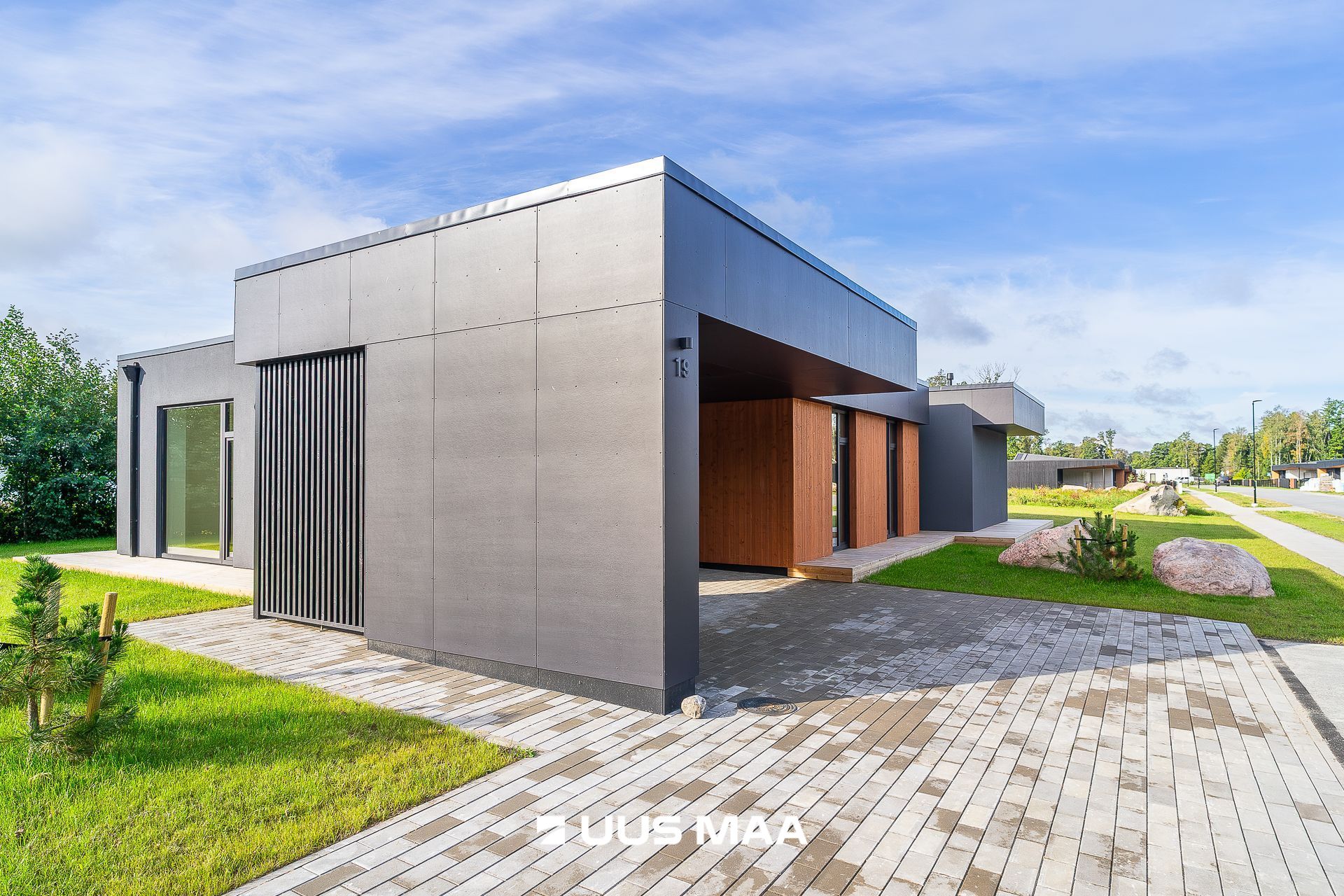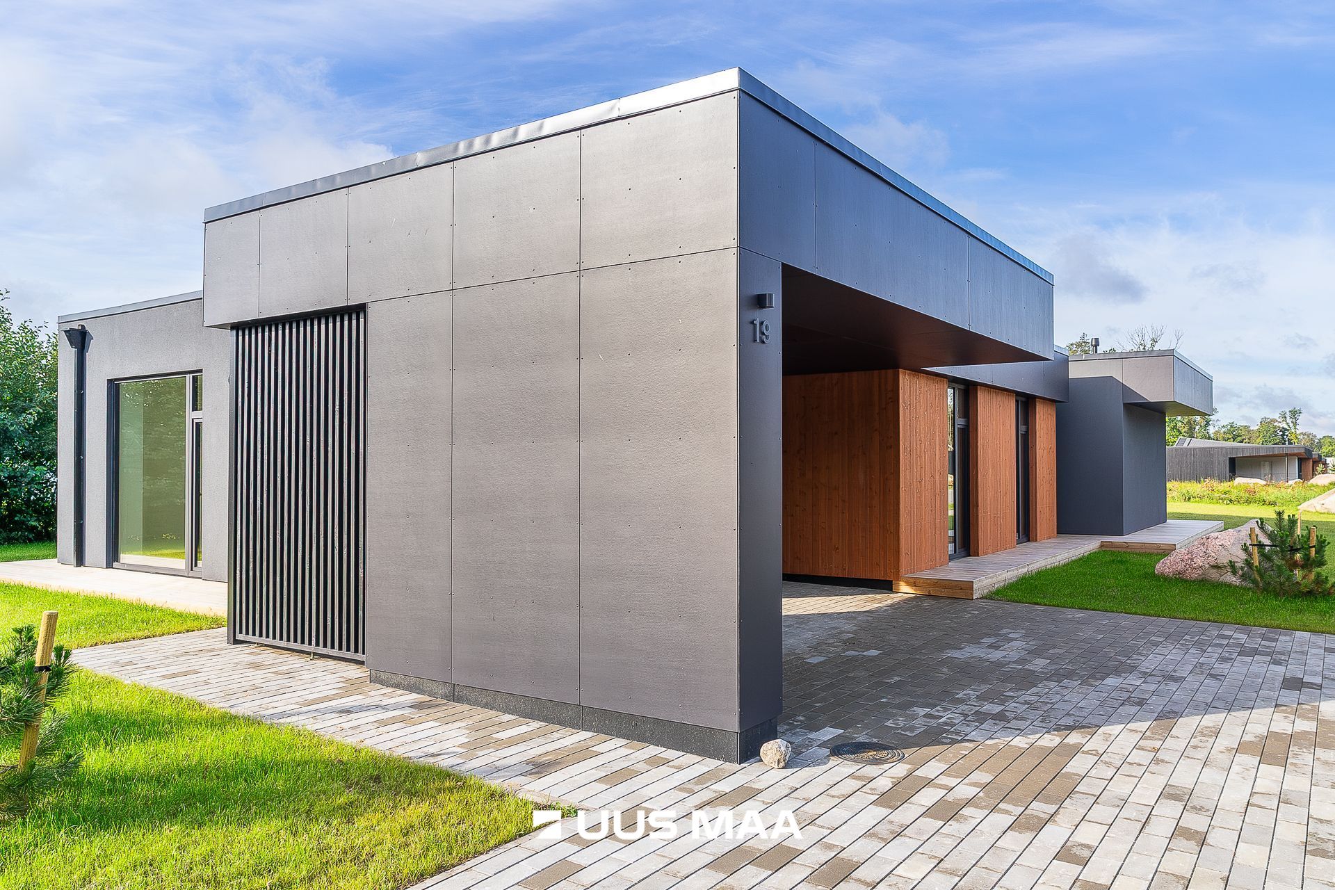 viimistlusmaterjalidena on kasutatud tumedat krohvi, puitu ja katuse parapetil halli viimistlusplaati.